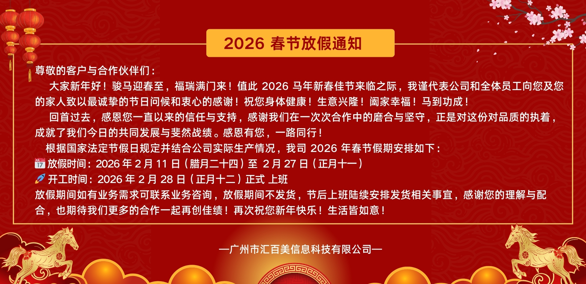 尊敬的客户与供应商合作伙伴们: 大家新年好!骏马迎春至,福瑞满门来!值此 2026 马年新春佳节来临之际,我谨代表公司和全体员工向您及您的家人致以最诚挚的节日问候和衷心的感谢!祝您身体健康!生意兴隆!阖家幸福!马到功成!回首过去,感恩您一直以来的信任与支持;感谢我们在一次次合作中的磨合与坚守,正是这份对品质的执着,成就了我们今日的共同发展与斐然战绩。感恩有您,一路同行!根据国家法定节假日规定
