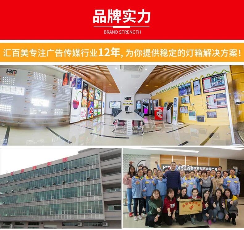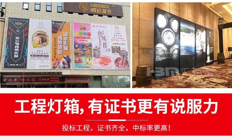 以上便是对户外广告灯箱安装需要注意事项的介绍了,如果您需要制作门头灯箱,不知道该如何选择,欢迎联系汇百美科技。汇百美广告灯箱,专注于生产、研发、销售拉布灯箱、灯箱铝型材等,广告传媒设备12年不忘初心一直专注于工程款,自主研发,不偷工减料,保障产品品质足料足厚的基础上再用工程力学几何设计型材保障拉布灯箱成品和铝材不变形、耐用、稳固、安全!